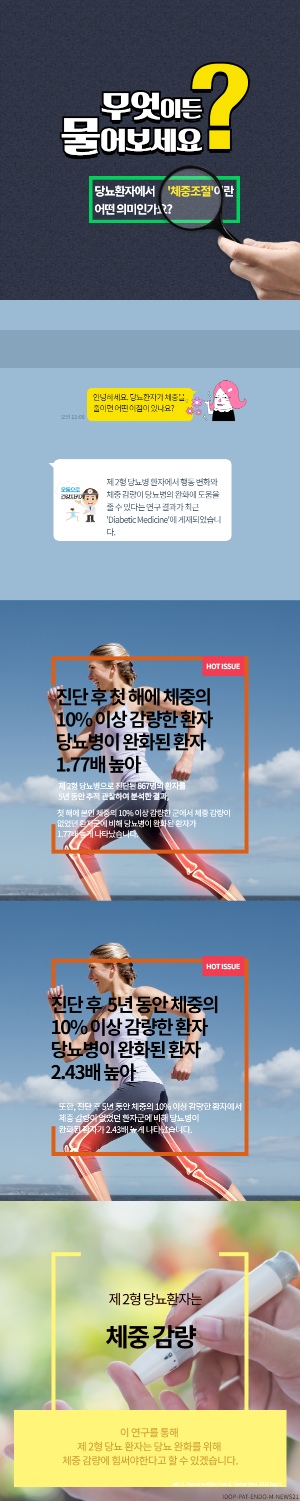 카드뉴스 상세 [카드뉴스] 당뇨 진단 후 체중 감량 당뇨병 완화에 도움 진료과목 : 내과 , 가정의학과 연관 질환백과 바로가기 과체중과 비만당뇨병당뇨병성 말초신경병증당뇨병성 족부 질환당뇨병성 케톤산증인슐린 비의존성 당뇨병인슐린 의존성 당뇨병임신성 당뇨병