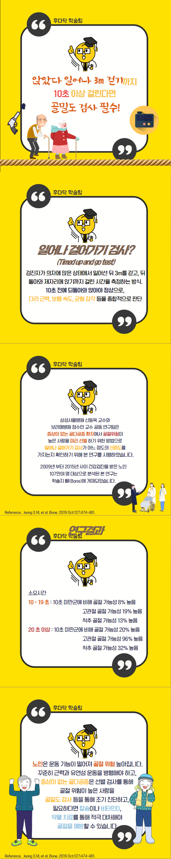 카드뉴스 상세 [카드뉴스] 앉았다 일어나 3m를 걷기까지 10초 이상이 걸린다면 골밀도 검사 필요 진료과목 : 내과 , 정형외과 , 가정의학과 연관 질환백과 바로가기 골감소증골다공증