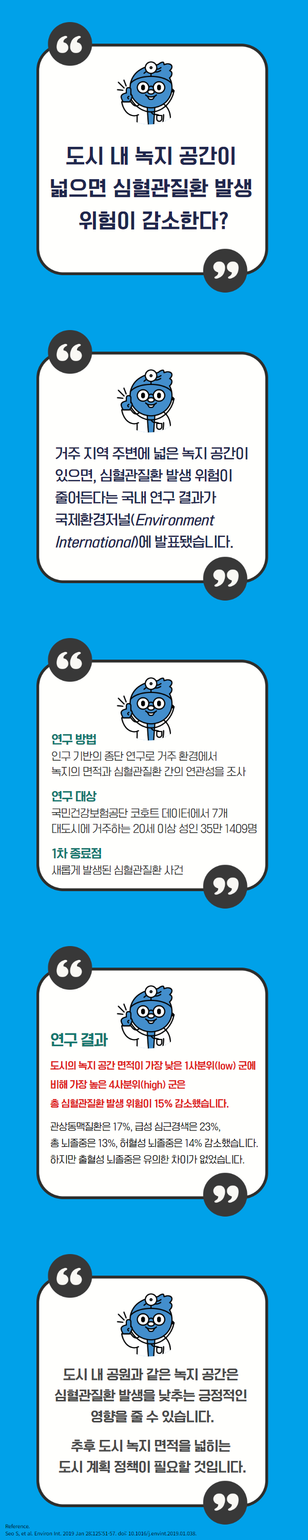 카드뉴스 상세 [카드뉴스] 도시 내 녹지 공간이 많으면 심혈관질환 발생 위험이 감소한다 진료과목 : 내과 , 가정의학과 연관 질환백과 바로가기 고혈압급성 심근경색뇌졸중당뇨병이상지질혈증