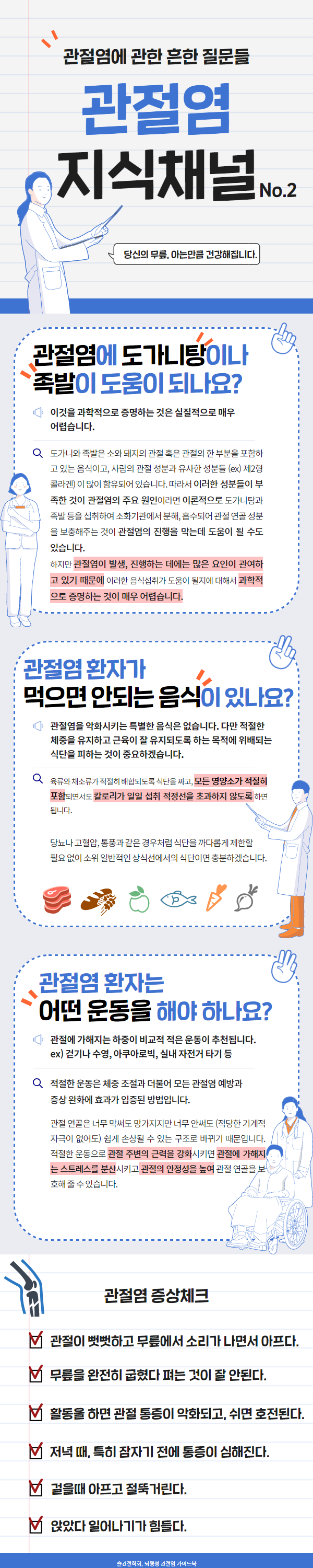 카드뉴스 상세 [카드뉴스] 관절염 지식채널 No.2 진료과목 : 정형외과 , 재활의학과 연관 질환백과 바로가기 골관절염관절염관절의 경직관절통류마티스관절염무릎관절증통풍성 관절염패혈성 관절염