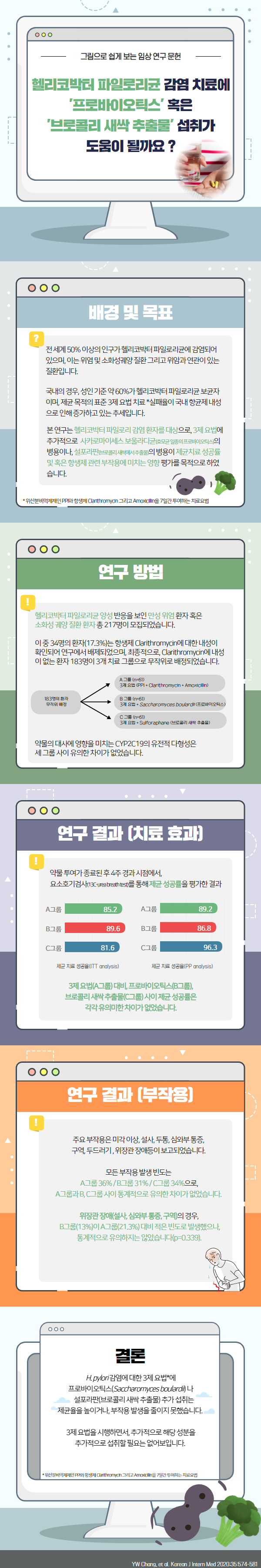 카드뉴스 상세 [카드뉴스] 헬리코박터 파일로리균 감염 치료에 프로바이오틱스나 브로콜리 새싹 추출물이 도움이 될까요? 진료과목 : 내과 , 가정의학과 연관 질환백과 바로가기 헬리코박터균 감염